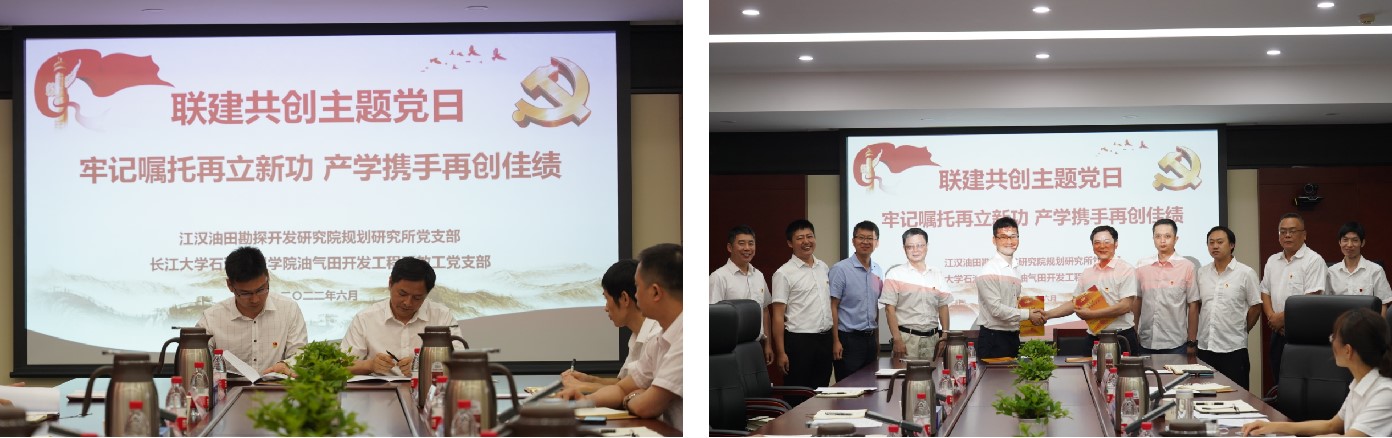 (通讯员 周晓峰)为进一步推进校企结对共建,切实发挥党建引领作用,6月30日上午,bv伟德国际1946油气田开发系教工党支部与江汉油田勘探开发研究院规划研究所党支部联建共创启动会暨“牢记嘱托再立新功 产学携手再创佳绩”支部主题党日活动在江汉油田勘探开发研究院举行。研究公司党委书记胡心玲、副经理荣焕青、院专家、联建支部党员代表,公司党委书记张光明、经理江厚顺、副经理李忠慧、联建支部党员代表等20余名同志参加,研究院规划研究所党支部书记康波主持。