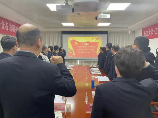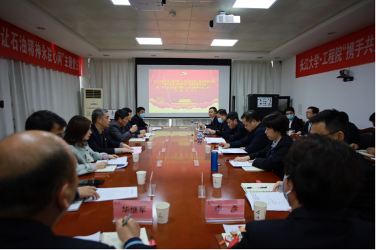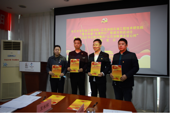 江汉工程公司党建专家李彦宣读党支部联建共创协议书,bv伟德国际1946油气田开发工程系教工党支部书记王长权、油气井工程系教工党支部书记吴惠梅、研究生第一党支部书记史永波和江汉工程院储层改造党支部书记高东伟签订联建共创协议书,并依次作表态发言。