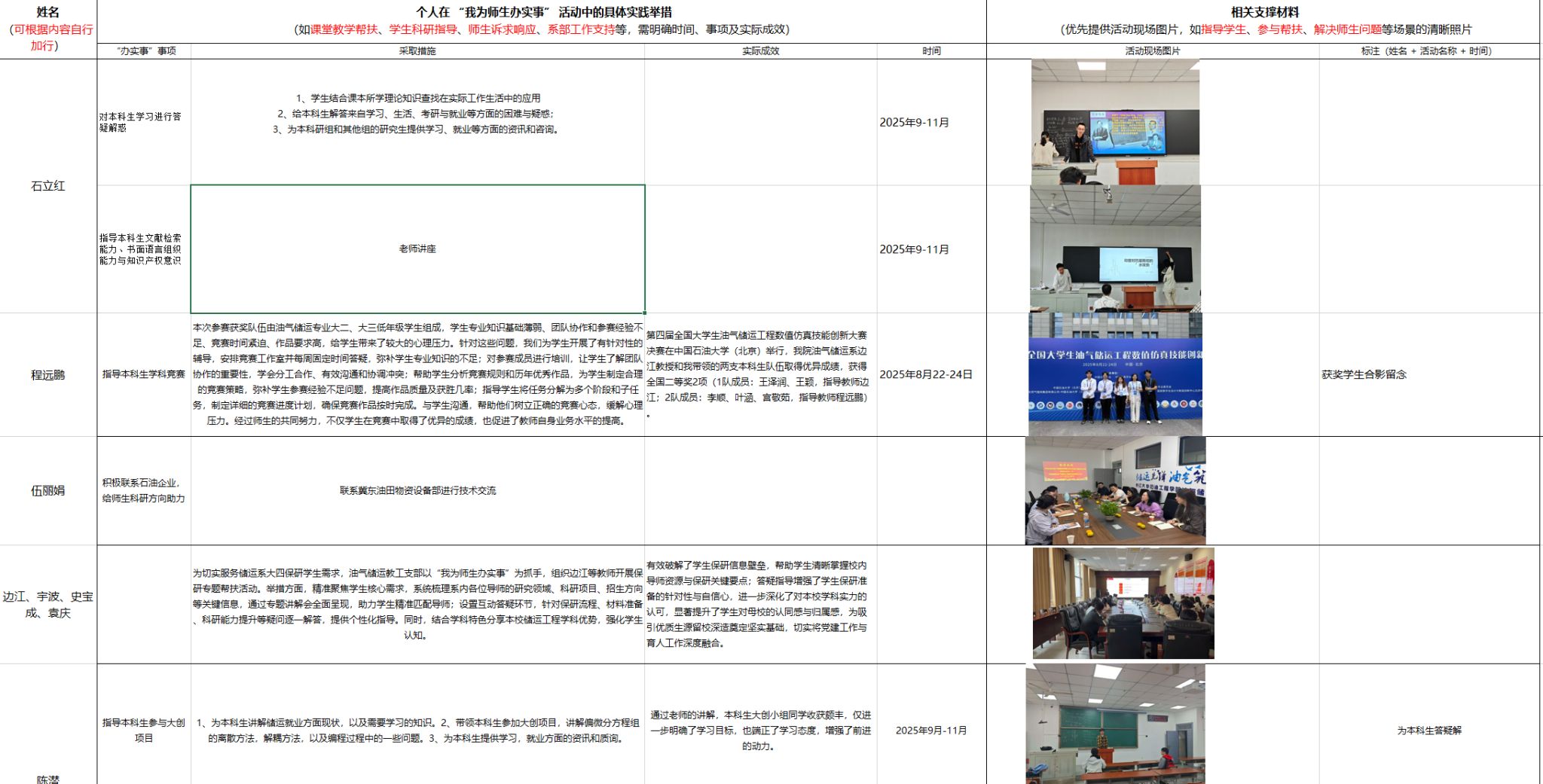 (通讯员 边江 伍丽娟)自2024年8月启动以来,油气储运工程系教工党支部“我为师生办实事”实践活动已扎实推进一年有余。支部始终坚持党建引领,以师生急难愁盼问题为导向,累计开展各类服务活动32场,覆盖师生800余人次,将党建成果切实转化为育人实效。通过一系列精准化、常态化服务举措,在员工成长成才、教师能力提升、教学科研发展等方面取得显著成效,书写了服务育人的生动答卷。
