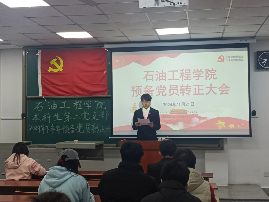 (通讯员 向雪芹/文 魏莉桐/摄)11月20日晚,本科生第二党支部于武教B-211召开2024年下半年预备党员接收、预备党员转正暨11月主题党日活动。本次会议由张硕主持,支部书记周晓峰和全体党员参加。