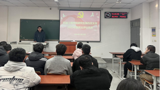 (通讯员 顾硕)1月12日下午,研究生第四党支部在B201召开2024年1月主题党日活动和2023年度民主评议党员大会,本次会议由王蒲金同志主持,支部书记郭冀宁和支部全体党员同志参加。
