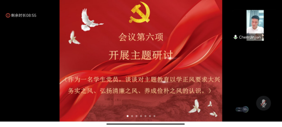 最后,支部书记陈金建同志做总结发言,强调了学习贯彻习近平新时代中国特色社会主义思想主题教育的重要性,希望全体党员进一步坚定理想信念,保持求真的精神,正确认识世界和中国发展大势,敢想敢为、善作善成,不断探寻适合自身发展的道路,成为合格的新时代党员。