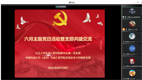 (通讯员 盛钲钦)2023年06月29日晚七时,bv伟德国际1946研究生第一党支部与中国石油大学(北京)井筒安全与控制党支部于腾讯会议召开六月主题党日活动暨支部共建交流。本次会议由王国庆同志主持,研究生第一党支部书记史永波老师、支部党员及井筒安全与控制党支部党员参会。