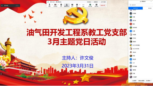 (通讯员 许文俊)3月31日晚上八点半,油气田开发工程系教工党支部以线上会议方式召开了2023年3月主题党日活动,支部书记许文俊同志主持。