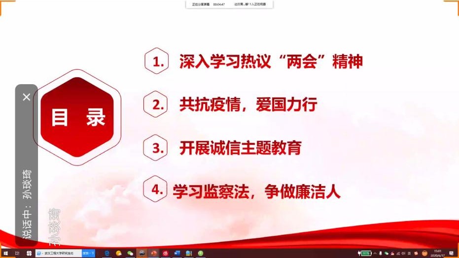 共抗疫情,爱国力行。团支书孙琰琦向大家讲述了传染病的防控知识:管理传染源,切断传播途径和保护易感人群;尤其是在疫情期间,应当不聚会、少外出、戴口罩和勤洗手;倡导大家注意心理健康和身体健康:保持心情愉悦,学会自我调节,当发现自己长期处于烦闷、沮丧或者恐惧等情绪的时候应及时与朋友或家人进行沟通交流,必要时可咨询学校的心理健康中心,及时进行调整;在家期间一周可进行2-5次的体育锻炼,每次0.5-1h来发展身体,增进健康,增强体质,调节精神。