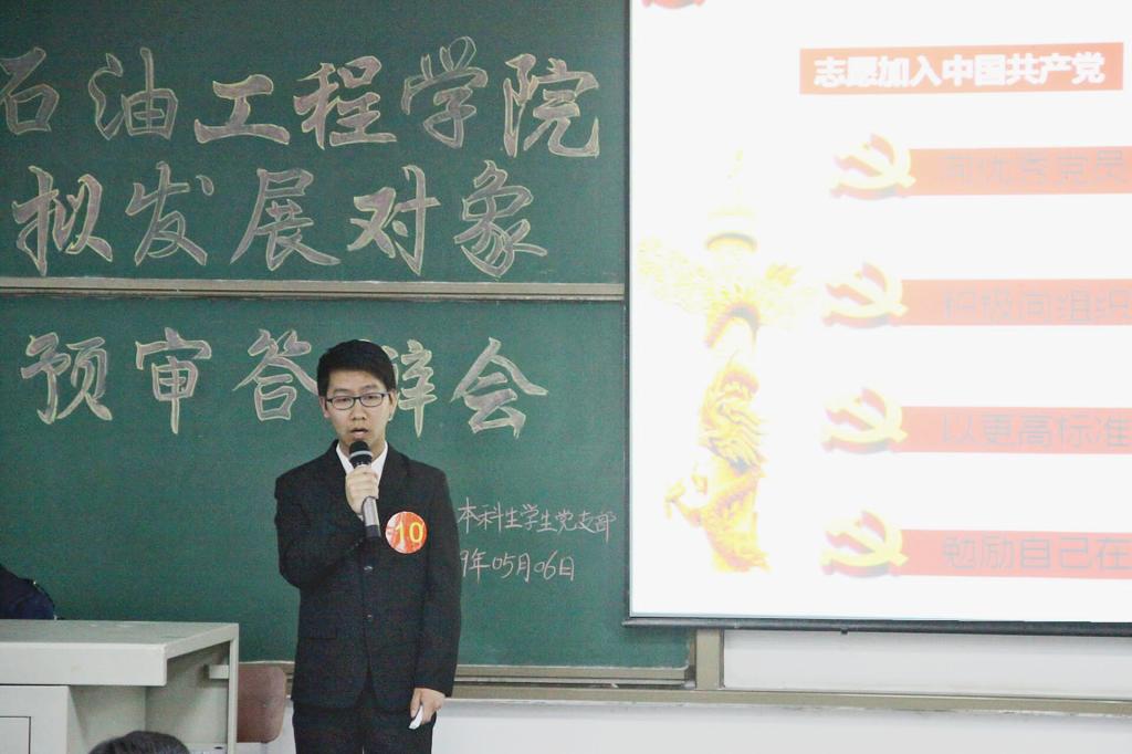 每一位答辩选手都是油工院最出色的学子,他们不仅仅是学习中的佼佼者,成绩名列专业前茅,更是bv伟德国际1946各个社团组织以及各类活动的引领者,带领同学们积极进取,奉献自己。在答辩的自我陈述部分,大家结合自身实际情况,具体深入地谈到了对党的认识、入党动机和自身的现实表现。在党识党情考察环节,每位答辩者都要从准备的题目中抽取一题作答。这些题目涉及到中国共产党的宗旨、党的性质、党在社会主义初级阶段的基本路线、党员的权利与义务、我国现阶段的基本矛盾等,大部分答辩者经过长期思想政治理论学习和熏陶都能流利作答。