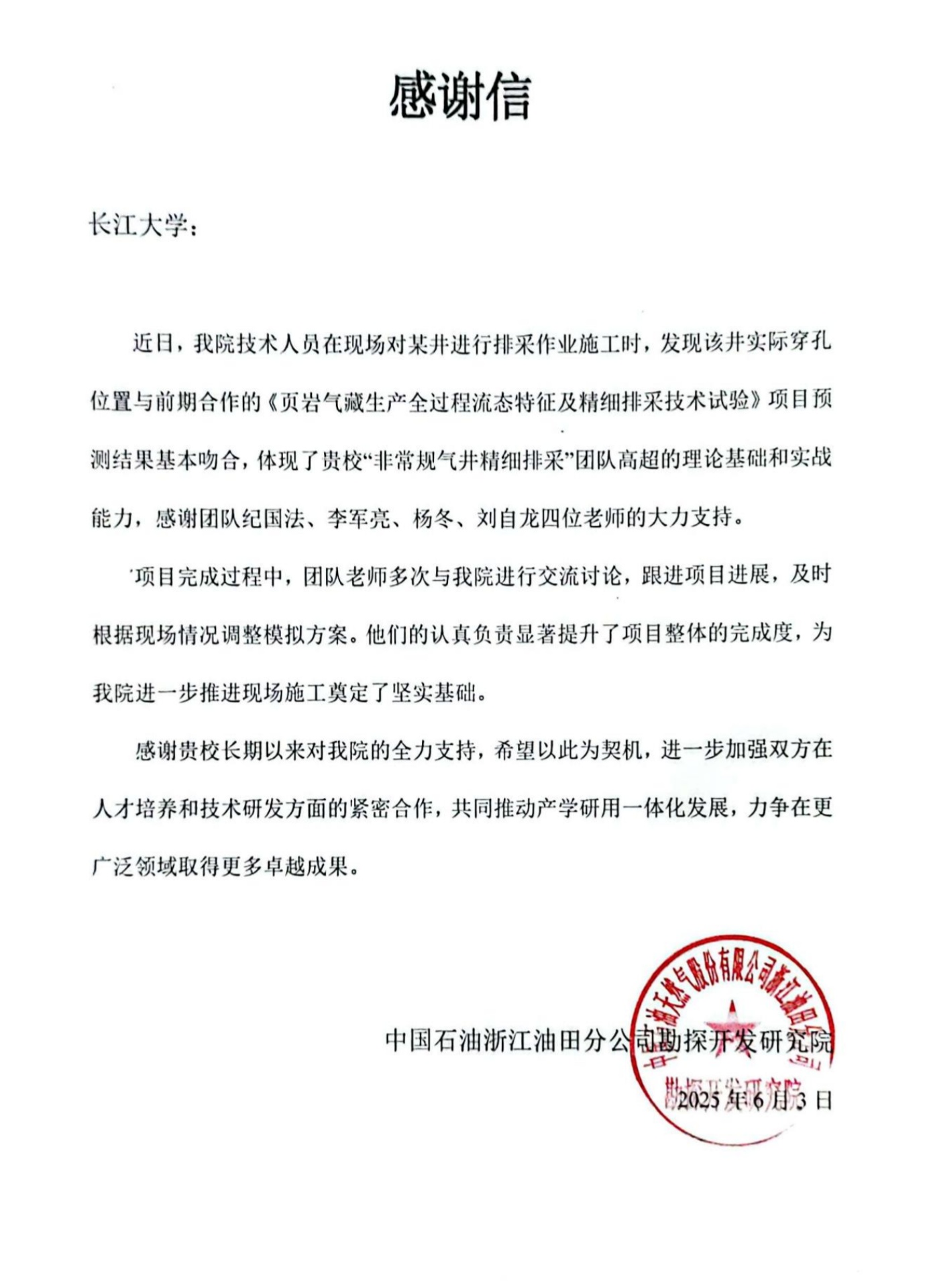 浙江油田勘探开发研究院在感谢信中表示,感谢公司⻓期以来对他们的全力支持,希望以此为契机,进一步加强双方在人才培养和技术研发方面的紧密合作,共同推动产学研用一体化发展,力争在更广泛领域取得更多卓越成果。