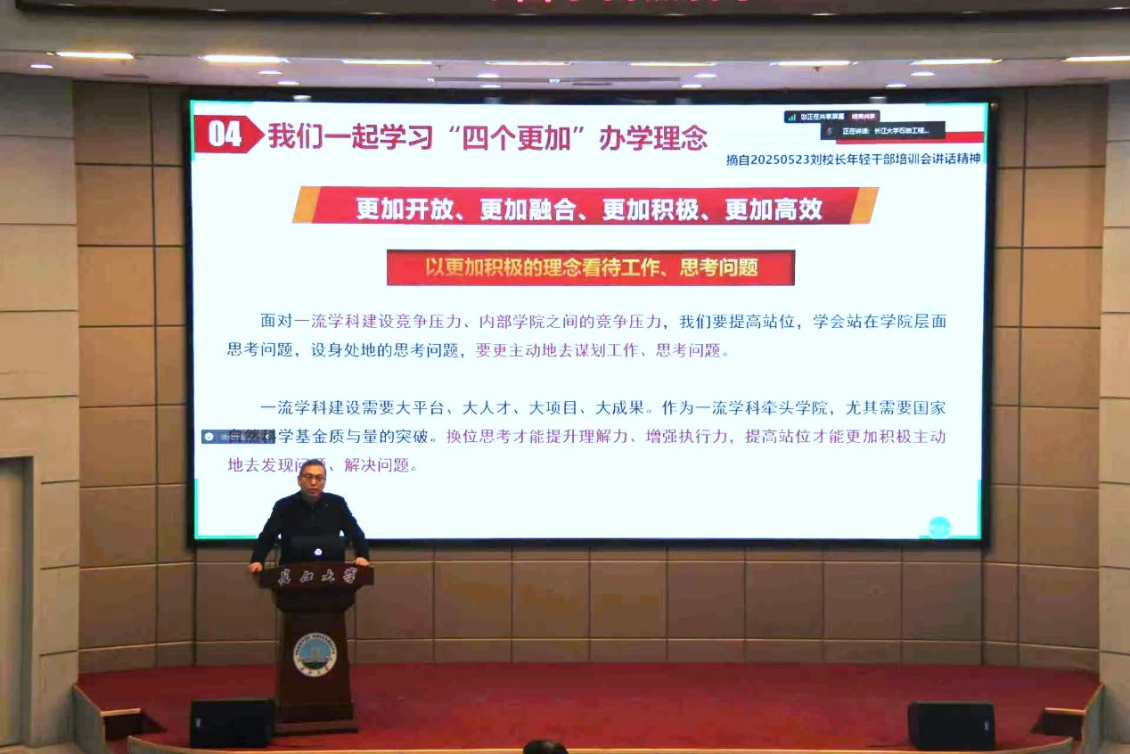 大会第二项,郑双进副经理作动员讲话,全面总结了学院历年国家自然科学基金申报与立项情况,明确提出“在稳步提升申报数量基础上实现质量突破”的核心目标,详细解读了学院配套激励政策,部署了2026年度申报工作进度安排。他表示,学院高度重视基金申报工作,将全力为科研人员提供全周期服务保障,希望老师们早启动、早筹备,精益求精打磨申报材料。最后,他带领老师们一起重新学习了“更加开放、更加融合、更加积极、更加高效”的办学理念,鼓励老师们要以更加开放的姿态汇聚资源,以更加融合的思维推动学科交叉,以更加积极的态度谋划科研选题,以更加高效的作风推进基金申报工作,切实将办学理念转化为科研实效。