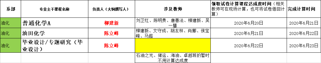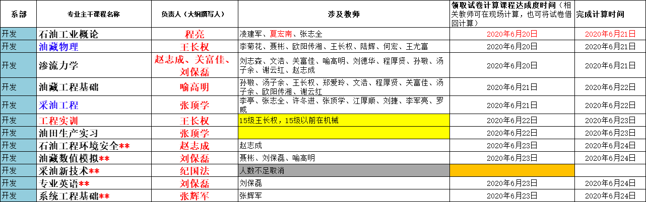 根据2020年6月16日专业认证推进会会议决定,公司石油工程专业19门课程的达成度计算由相关课程任课教师负责,各系主任(钻井系熊青山教授、开发系张顶学教授、油化系付美龙教授)负责落实安排具体完成教师,完成达成度计算的截止时间为6月24日。相关课程、课程大纲撰写人、授课教师名单、领取试卷时间安排等见附件。