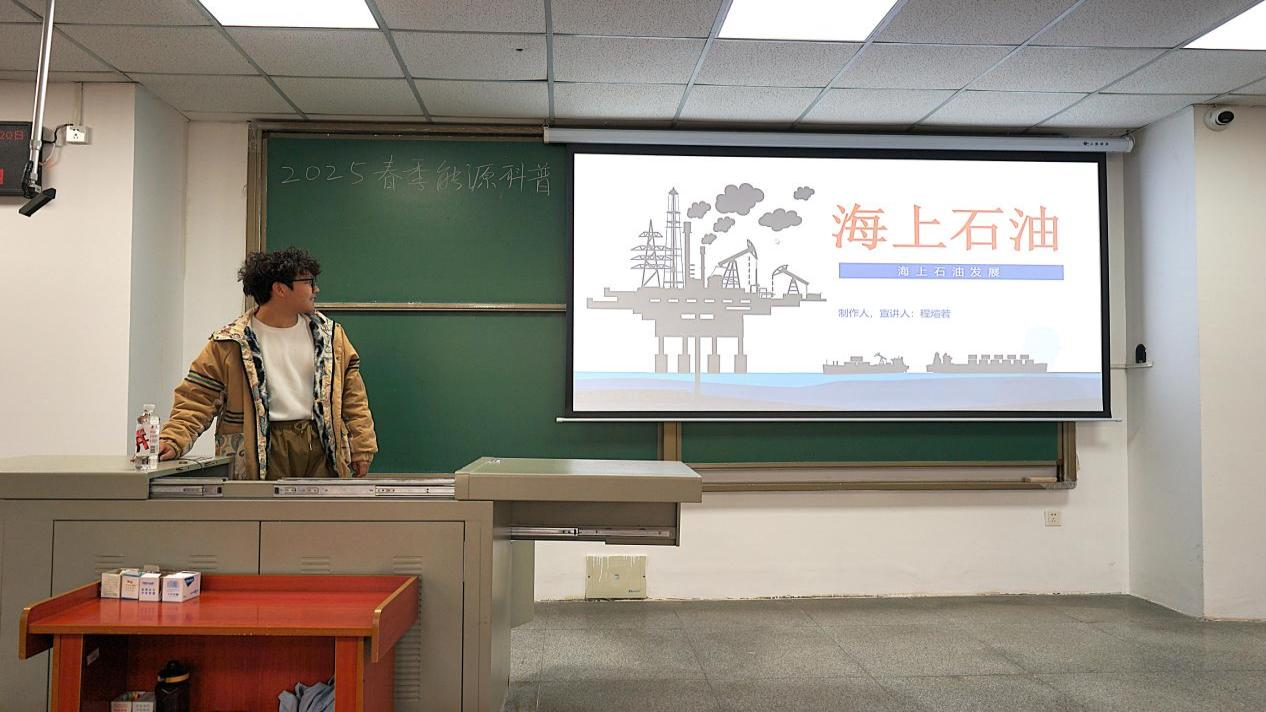2025年3月20日,bv伟德国际1946黑油能源科普宣讲队在B教108开展了主题为“走向深海——中国海洋油气发展之路”的能源科普宣讲活动。主讲人程煊若围绕我国海洋油气开发的历史、技术突破、未来发展方向等多个方面进行了深入讲解。并结合视频演示环节,展示了海底地震勘探技术、钻井平台运作模式以及海上油气田的实际应用案例。同学们纷纷表示,通过此次宣讲,他们对海洋油气的勘探技术、生产模式以及国家能源安全的重要性有了更深刻的认识,希望未来可以为祖国的油气事业贡献自己的一份力量。