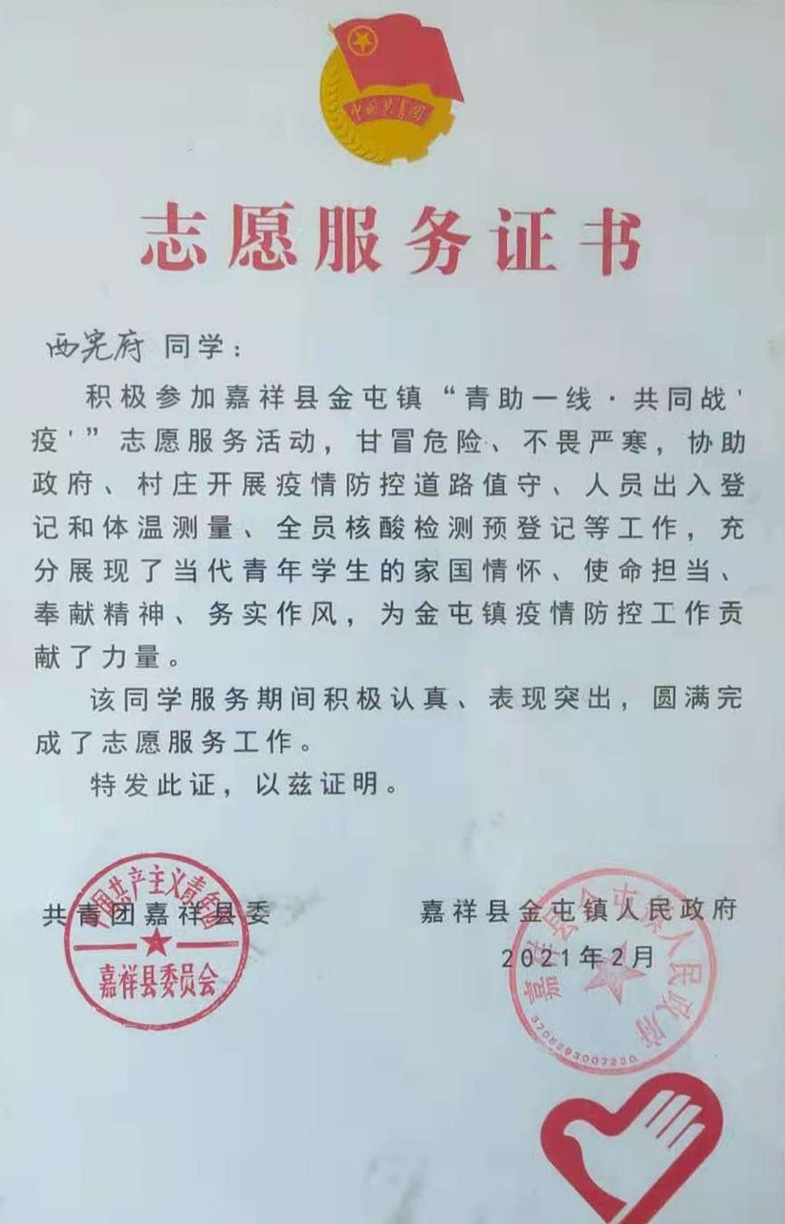 在这场战役中,公司bv伟德国际1946海洋油气工程专业2018级1班西宪府同学,主动参加嘉祥县“‘青’助一线,共同战‘疫’”志愿服务活动。从每天的定点站岗执勤,再到公共设施的消毒、帮助发放口罩、酒精等工作,西宪府同学甘冒风险、不畏严寒,用实际行动诠释了勇敢于坚强、责任与担当,实现了走上社会舞台的“精彩亮相”。西宪府同学用行动证明了青年一代有担当、敢于担当的精神面貌。在这场疫情防控战争中,西宪府同学在做好每一件小事、完成每一项任务、履行每一项职责中无私奉献自己的青春力量。为嘉祥县疫情防控工作贡献了力量。